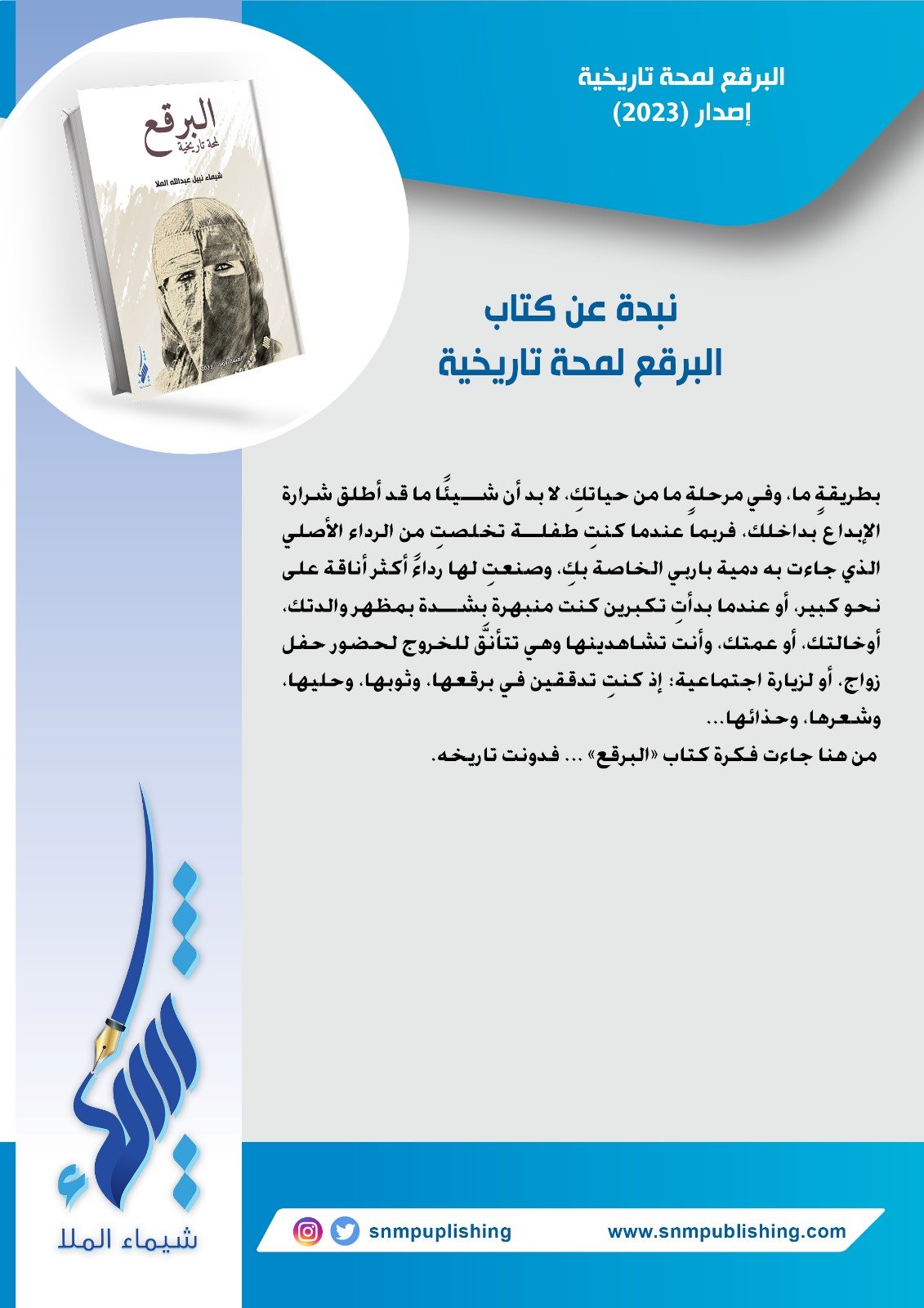 بطريقةٍ ما، وفي مرحلةٍ ما من حياتكِ، لا بد أن شيئًا ما قد أطلق شرارة الإبداع بداخلك، فربما عندما كنتِ طفلة تخلصتِ من الرداء الأصلي الذي جاءت به دمية باربي الخاصة بكِ، وصنعتِ لها رداءً أكثر أناقة على نحو كبير، أو عندما بدأتِ تكبرين كنت منبهرة بشدة بمظهر والدتك، أوخالتك، أو عمتك، وأنت تشاهدينها وهي تتأنَّق للخروج لحضور حفل زواج، أو لزيارة اجتماعية؛ إذ كنتِ تدققين في برقعها، وثوبها، وحليها، وشعرها، وحذائها... من هنا جاءت فكرة كتاب «البرقع» ... فدونت تاريخه.