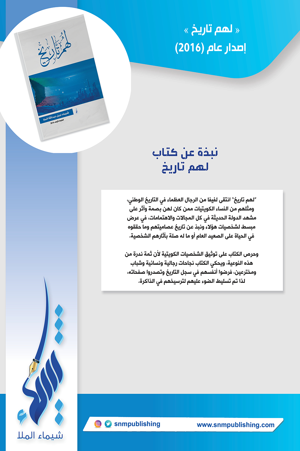 يشبه كتاب " لهم تاريخ " إلى حد ما كتاب الأوائل في كونه توثيقيا ويعمل على إلقاء الضوء على رجال ونساء كويتيين تركوا بصمات واضحة ومميزة في مشهد الدولة الحديثة، وقد تم اختيار هؤلاء بعناية نظرا لما تركوه من أثر في جميع المجالات والاهتمامات البشرية . وقدم الكتاب هؤلاء المتميزين في عرض مبسط لشخصياتهم العصامية وما حققوه في الحياة على الصعيد العام أو ما تركوه من إنجازات لها أثر إيجابي على المجتمع والدولة.
