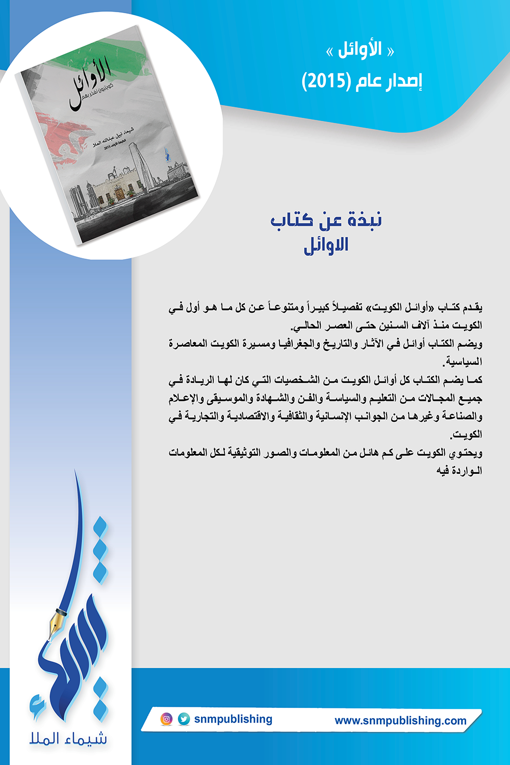 كتاب الأوائل هو أول إصدار لدار شيماء نبيل الملا للنشر والتوزيع وهو باكورة أعمال الاستاذة شيماء نبيل الملا ويأخذ الكتاب الأسلوب التاريخي التوثيقي. حيث يوثق أعمال أوائل الكويتيين المتميزة والمبدعة والتي تركت أثرا في كلّ المجالات الاجتماعية والسياسية والاقتصادية والفنية والرياضية وغيرها.