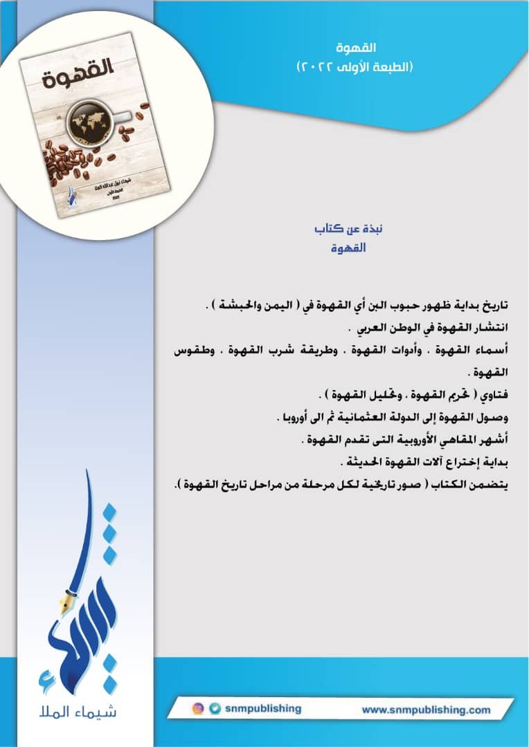 تاريخ بداية ظهور حبوب البن أي القهوة في(اليمنوالحبشة) انتشار القهوة في الوطن العربي . أسماء القهوة , وأدوات القهوة , وطريقة شرب القهوة , وطقوس القهوة. فتاوي (تحريم القهوة , وتحليل القهوة) وصول القهوة إلى الدولة العثمانية ثم إلى أوروبا. أشهر المقاهي الاوروبية التي تقدم القهوة . بدايه إختراع آلات القهوة الحديثة . يتضمن الكتاب ( صور تاريخية لكل مرحلة من مراحل تاريخ القهوة).