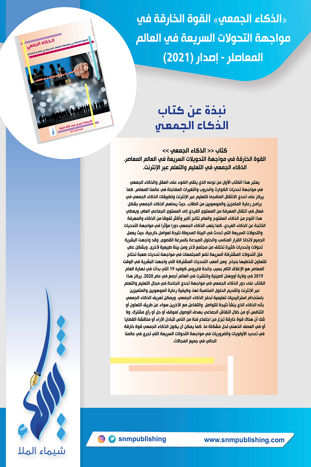 . كما يلعب الذكاء الجمعي دورا مؤثرا في مواجهة التحديات والتحولات السريعة التي تحدث في البيئة المحيطة نتيجة لعوامل خارجية، حيث يعمل الجميع لاتخاذ القرار المناسب والحلول المبدعة بالسرعة القصوى. وقد واجهت البشرية تحولات وتحديات كثيرة تختلف من مجتمع لآخر ومن بيئة طبيعية لأخرى. وبشكل عام فإن التحولات المشتركة السريعة تضع المجتمعات في مواجهة تحديات صعبة وتحتاج للتعاون لتخطيها بنجاح. ومن أصعب التحديات المشتركة التي واجهت البشرية في الوقت المعاصر هو الإغلاق التام بسبب جائحة فايروس كوفيد 19التي بدأت في نهاية العام 2019 في ولاية يوهان الصينية وانتشرت في العالم أجمع في عام 2020. يركز هذا الكتاب على دور الذكاء الجمعي في مواجهة تحدي الجائحة في مجال التعليم والتعلم عبر الإنترنت وتقديم الحلول المناسبة لها، وكيفية رعاية الموهوبين والمتميزين باستخدام استراتيجيات تعليمية تحفز الذكاء الجمعي.