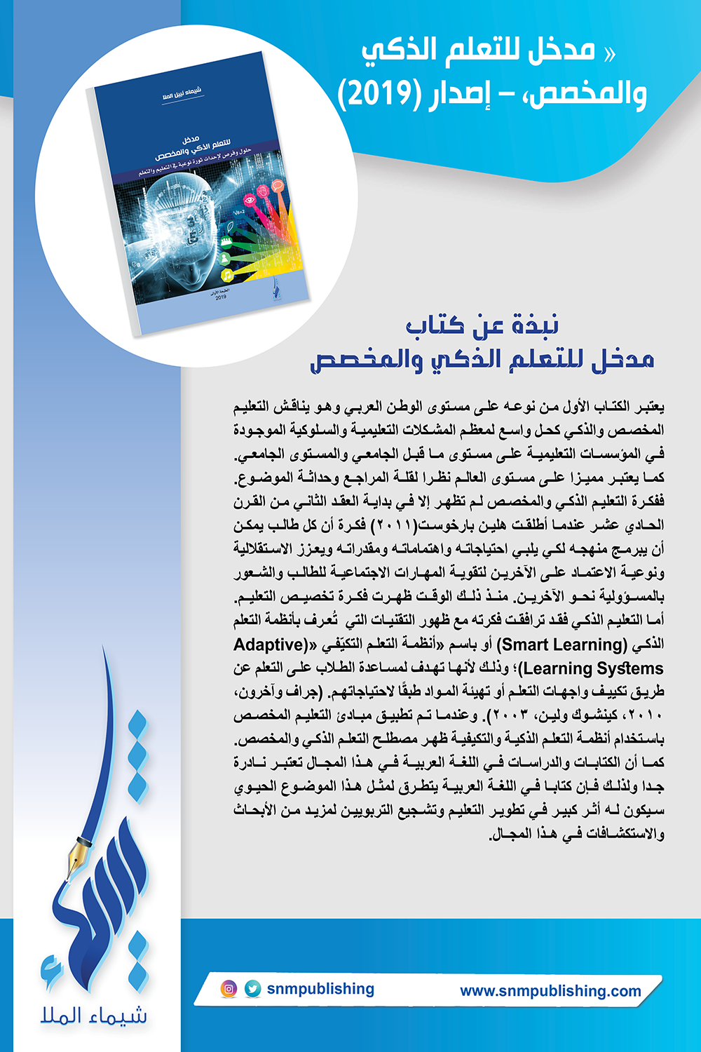 يهدف هذا الكتاب إلى تعريف التعلم الذكي والمخصص والفرص والحلول التي يقدمها هذا النمط من التعلم وقدرته على إحداث ثورة نوعية في المدارس والجامعات في العالم. يعتبر التعلم الذكي والمخصص أسلوبا أو توجها جديدا في عالم التعليم سواء المدرسي أو الجامعي. ويعتمد هذا النمط من التعليم على التقنيات الذكية التكيفية لجعل التعلم مخصصا ومناسبا لجميع الطلاب حسب اختلاف قدراتهم لضمان العدالة والجودة.