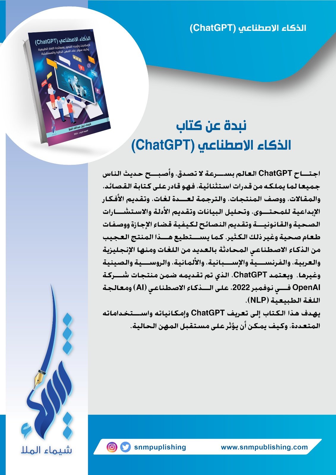 اجتاح ChatGPT العالم بسرعة لا تصدق، وأصبح حديث الناس جميعا لما يملكه من قدرات استثنائية، فهو قادر على كتابة القصائد، والمقالات، ووصف المنتجات، والترجمة لعدة لغات، وتقديم الأفكار الإبداعية للمحتوى، وتحليل البيانات وتقديم الأدلة والاستشارات الصحية والقانونية وتقديم النصائح لكيفية قضاء الإجازة ووصفات طعام صحية وغير ذلك الكثير. كما يستطيع هذا المنتج العجيب من الذكاء الاصطناعي المحادثة بالعديد من اللغات ومنها الإنجليزية والعربية، والفرنسية والإسبانية، والألمانية، والروسية والصينية وغيرها. ويعتمد ChatGPT، الذي تم تقديمه ضمن منتجات شركة OpenAI في نوفمبر 2022، على الذكاء الاصطناعي (AI) ومعالجة اللغة الطبيعية (NLP). يهدف هذا الكتاب إلى تعريف ChatGPT وإمكانياته واستخداماته المتعددة، وكيف يمكن أن يؤثر على مستقبل المهن الحالية.