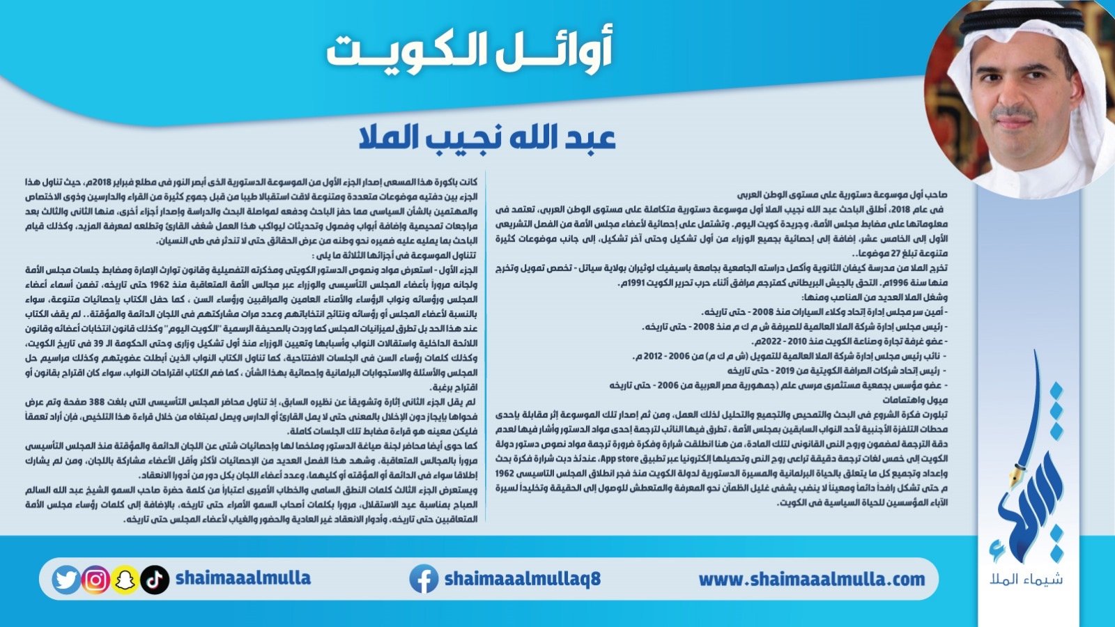 يعتبر كتاب "أوائل الكويت" موسوعة تفصيلية لعدد كبير ومتنوع عن كل ما هو الأقدم في تاريخ الكويت والذي يعود لآلاف السنين قبل الميلاد حتى العصر الحالي. ويضم هذا الكتاب الأوائل في الآثار والتاريخ والجغرافيا ، كما يغطي مسيرة الكويت المعاصرة في مجال السياسة.و يضم الكتاب أيضا كل أوائل الكويت من الشخصيات التي كان لها الريادة في جميع المجالات من التعليم والسياسة والفن والعلوم والموسيقى والإعلام والصناعة والتجارة وغيرها من الجوانب الإنسانية والثقافية والسياسية والاقتصادية والتجارية في الكويت. كما تحتوي موسوعة " أوائل الكويت" على كم هائل من المعلومات والصور التوثيقية. ومن أجل إبراز دور جميع الأوائل في الكويت في مختلف المجالات وبشكل متواصل زمنيا قمنا بإنشاء هذا الموقع الالكتروني الذي يتم تحديثه باستمرار ، كما سيتم طباعة هذه الموسوعة في نسخة ورقية محدثة .