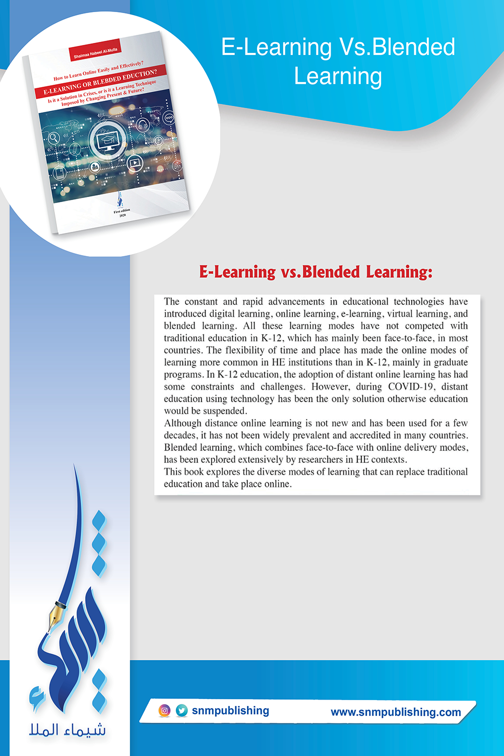 This book provides meaningful information, definitions, concepts, and development tools that can be used to make the learner have better understanding of new learning methods. It is one of the most up-to-date books that discusses and covers all the variables related to e-learning. It compares the different concepts of e-learning like online learning, distance learning, synchronous, and asynchronous learning. It also introduces blended learning, which combines both traditional learnings with online learning and the educational digital technologies that can be used to provide e-learning modes. All these topics make this book one of the rare publications that provide readers with hands-on experience about online and blended learning.