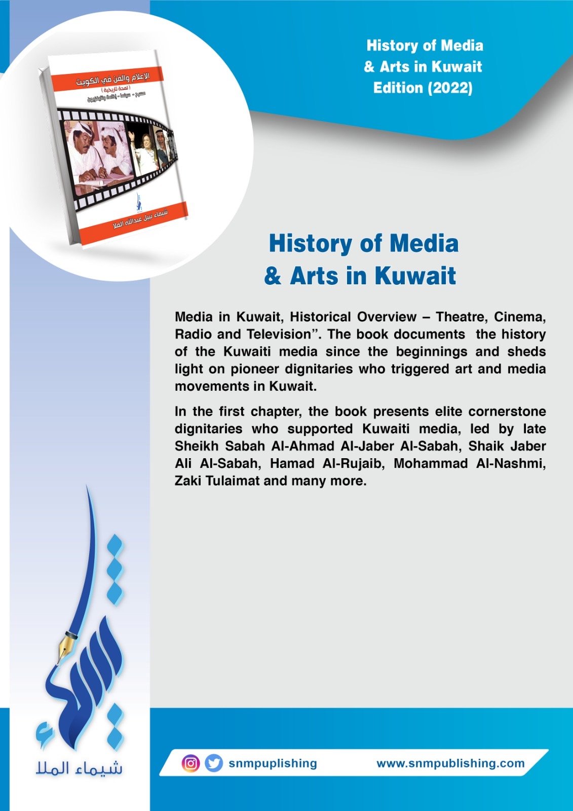 The book documents the history of the early Kuwaiti media and sheds light on pioneer dignitaries who triggered art and media movement in Kuwait. The first chapter deals with the Kuwaiti Theatre, the second sheds light on Kuwait theatre, cinema, radio & TV pioneers. The third chapter talks about Kuwaiti drama, while the fourth chapter deals with Kuwaiti cinema.