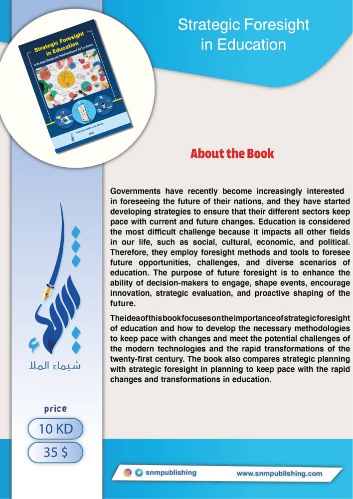 The idea of this book focuses on the importance of strategic foresight of education and how to develop the necessary methodologies to keep pace with changes and meet the potential challenges of the modern technologies and the rapid transformations of the twenty-first century. The book also compares strategic planning with strategic foresight in planning to keep pace woth the rapid changes and transformation in education .