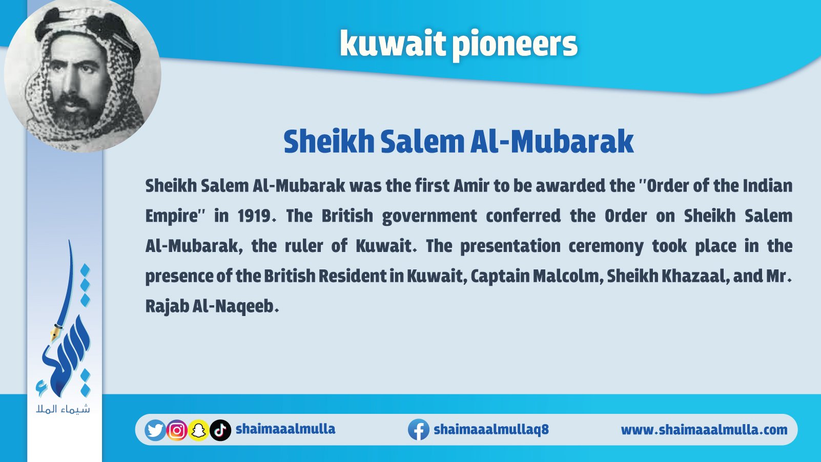 “Pioneers of Kuwait" is an encyclopedia contains a huge amount of information and images that cover all the earliest figures and achievements in various fields of the history of Kuwait. The book includes those who are pioneer in many fields such as: archaeology, history, geography, education, politics, arts, science, music, media, and other humanitarian, cultural, political, economic, and commercial aspects in the history of Kuwait.