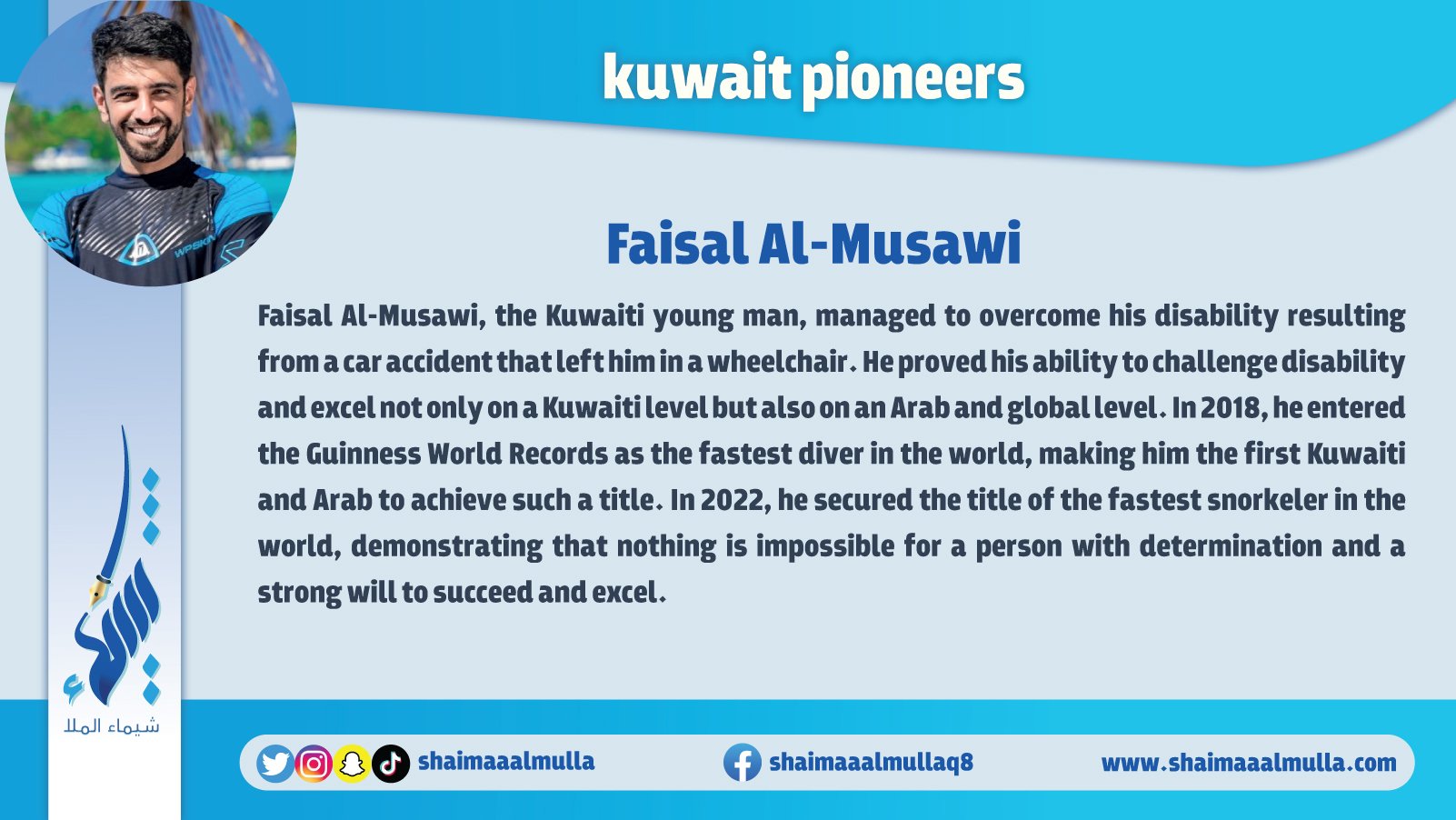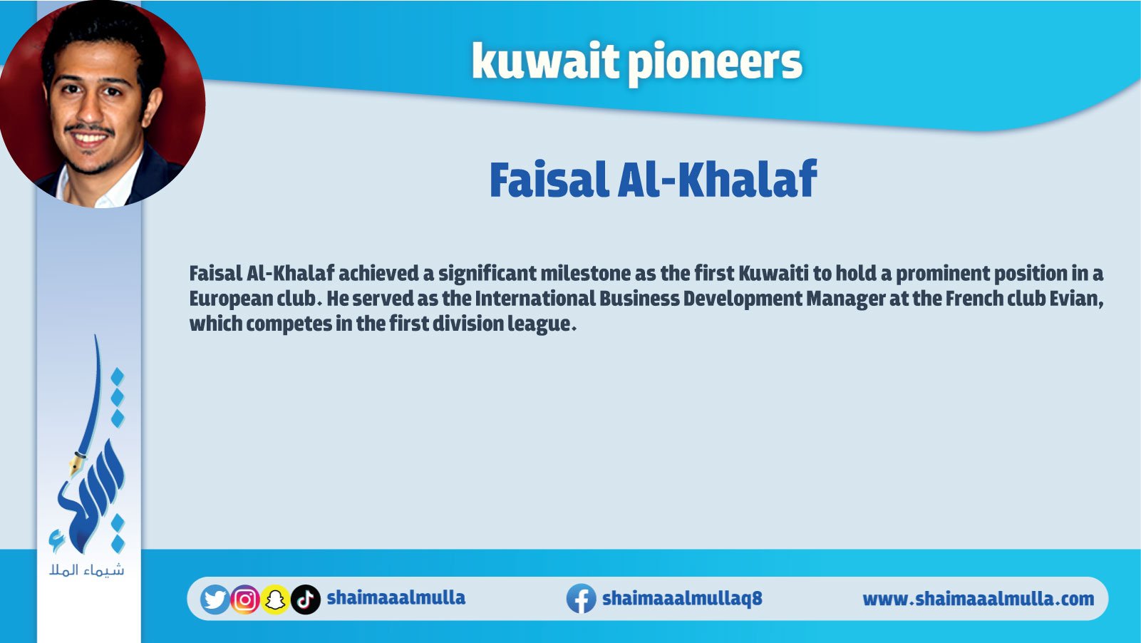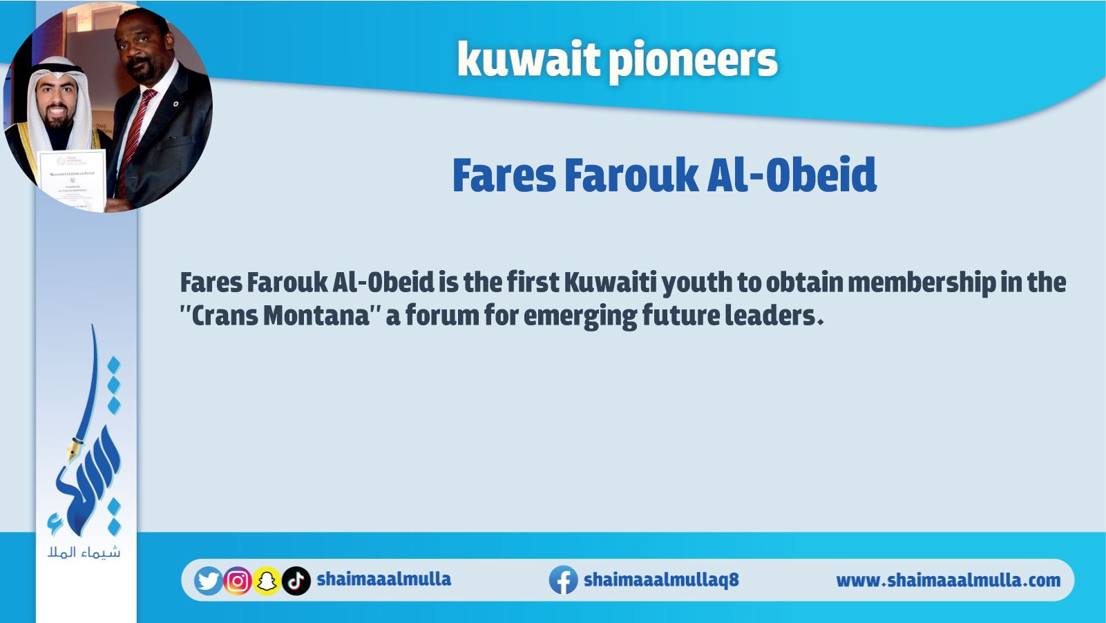 “Pioneers of Kuwait" is an encyclopedia contains a huge amount of information and images that cover all the earliest figures and achievements in various fields of the history of Kuwait. The book includes those who are pioneer in many fields such as: archaeology, history, geography, education, politics, arts, science, music, media, and other humanitarian, cultural, political, economic, and commercial aspects in the history of Kuwait.
