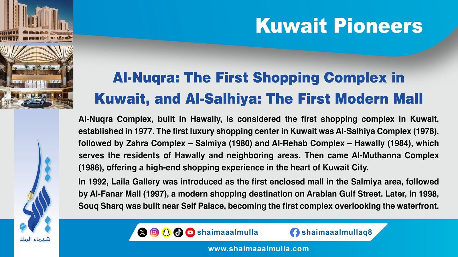 “Pioneers of Kuwait" is an encyclopedia contains a huge amount of information and images that cover all the earliest figures and achievements in various fields of the history of Kuwait. The book includes those who are pioneer in many fields such as: archaeology, history, geography, education, politics, arts, science, music, media, and other humanitarian, cultural, political, economic, and commercial aspects in the history of Kuwait.